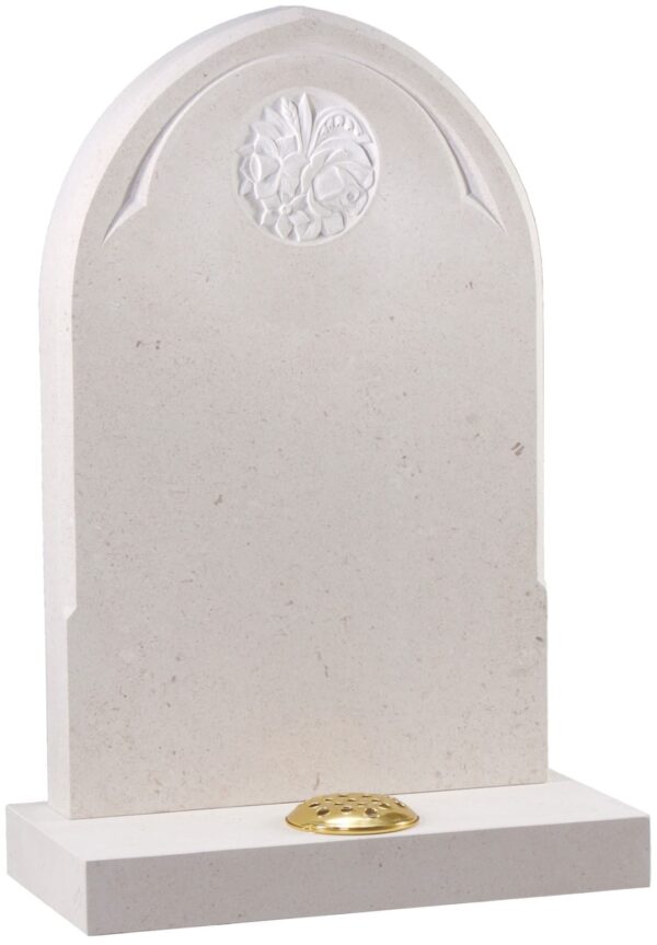 The WG179 memorial headstone features an elegant Gothic shape with a tapered pin line frame and central carved panel. Crafted from durable Brenna Stone, this timeless design offers a dignified tribute for your loved one.