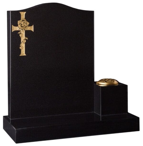 The WG41 Cemetery Memorial features an asymmetrical design with the headstone positioned left of the base and a complementary vase block to the right. Adorned with a gilded cross and rose ornament, this thoughtful memorial offers a dignified tribute to your loved one. Request a quote for personalisation options.