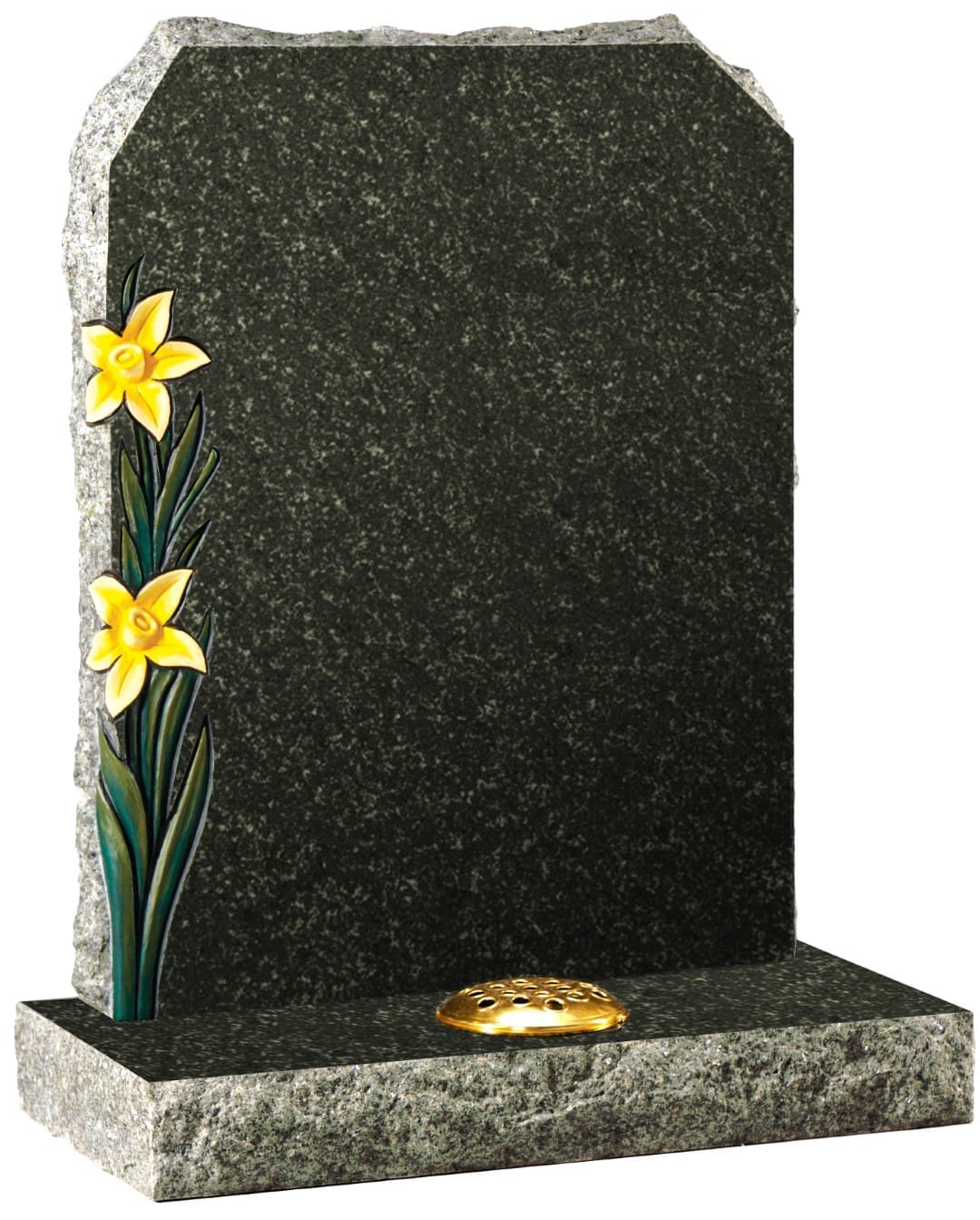The contrast between the textured stone and the vibrant daffodils creates a striking visual representation of enduring memories and new beginnings. Daffodils symbolise rebirth and hope, offering comfort during times of remembrance.