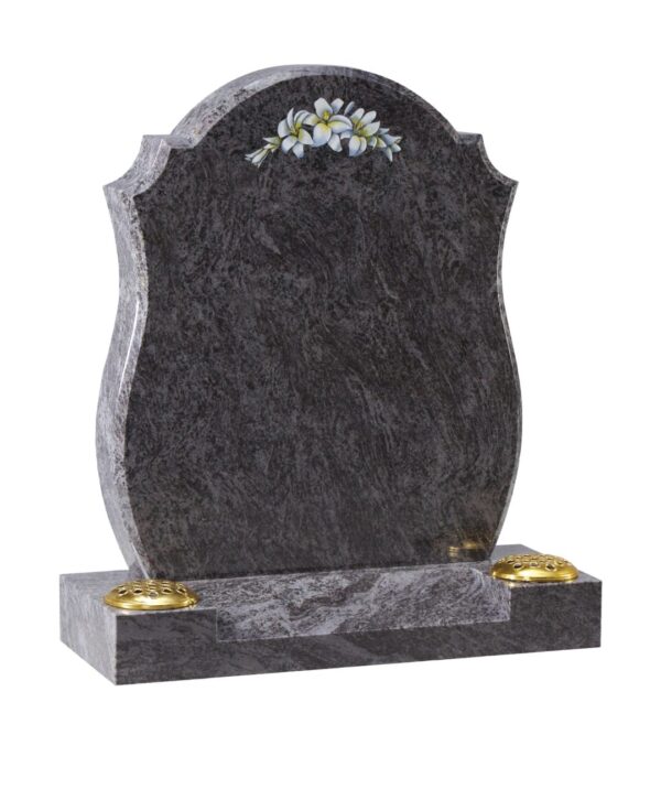 The WG8 Cemetery Memorial features an elegant spray of painted lilies adorning the headstone, set gracefully on a centre splay base. This dignified memorial serves as a lasting tribute, symbolising purity and eternal remembrance of your loved one.